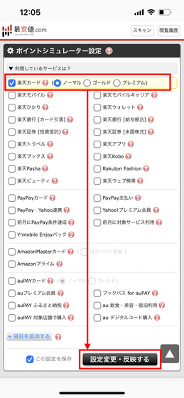 例えば楽天であれば、楽天カードを利用して楽天市場で買い物をすることで、通常より多くのポイントを獲得できるサービスが展開されています。このようにポイントが付与されるサービスを利用して商品を購入する場合、例え表示価格が最安値でなくとも、還元されるポイントを加味した結果「実質最安値」となることがあります。そんな実質価格を計算してくれるのがこのシミュレーター。試しに「楽天カード(ノーマル)」にチェックを入れて「設定変更・反映する」をクリックしてみます。