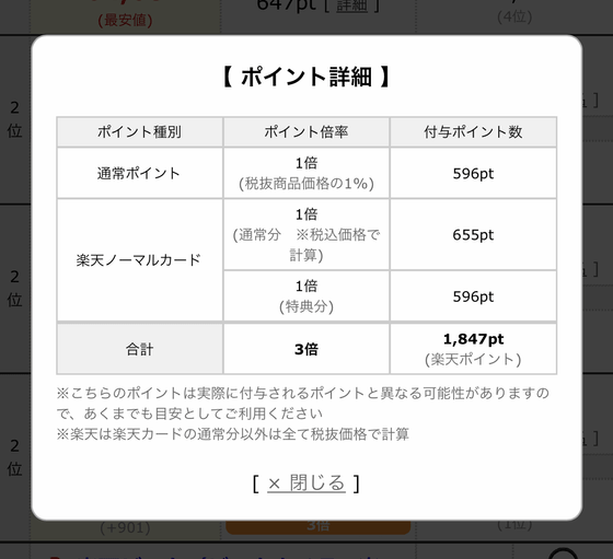 ちなみにポイントの計算方法はこんな感じ。楽天ではカードの所有状況によって獲得できるポイントが変化するのですが、複雑なポイント計算もバッチリこなしてくれます。