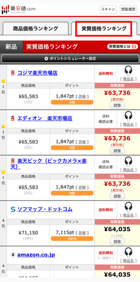 商品価格ランキングの隣にある「実質価格ランキング」をタップすることで、ポイントシミュレーターの設定を反映した価格ランキングを確認できます。ポイントを反映すると順位がガラッと変わるので、ポイントを多用する場合は実質価格ランキングを参考にするのがオススメ。