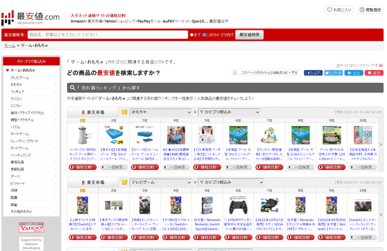 各販売サイトの「売れ筋ランキング」を確認でき、検索時点で人気の商品がすぐに分かるようになっています。今回検索した時期は気温が高まる7月初旬のため、「おもちゃ」カテゴリではプール用品など涼しげな商品が並んでいました。