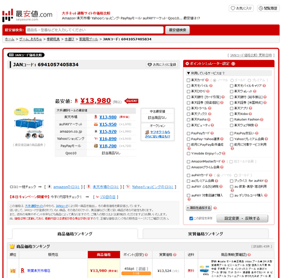 すると、価格比較ページにアクセスできます。このページではアプリ版と同様に価格ランキングを確認したり、ポイントを加味した実質価格をチェックしたりできます。