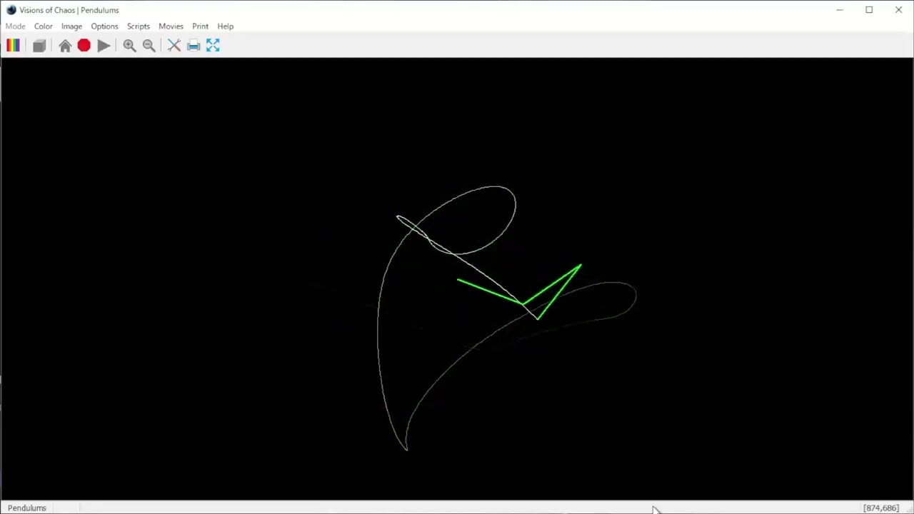 Visions of Chaosでは二重振り子・三重振り子・四重振り子をシミュレーションができます。以下のムービーでは実際に二重振り子・三重振り子・四重振り子の奇妙な振る舞いを見ることができます。