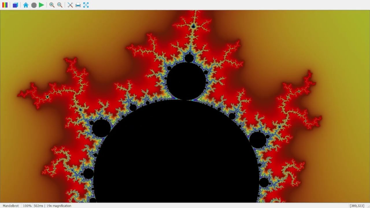 すると、以下のようにマンデルブロ集合をフラクタル図形として表現した図が生成されました。図の上でドラッグをすると、拡大アイコンが表示され、左上の「+」をクリックします。