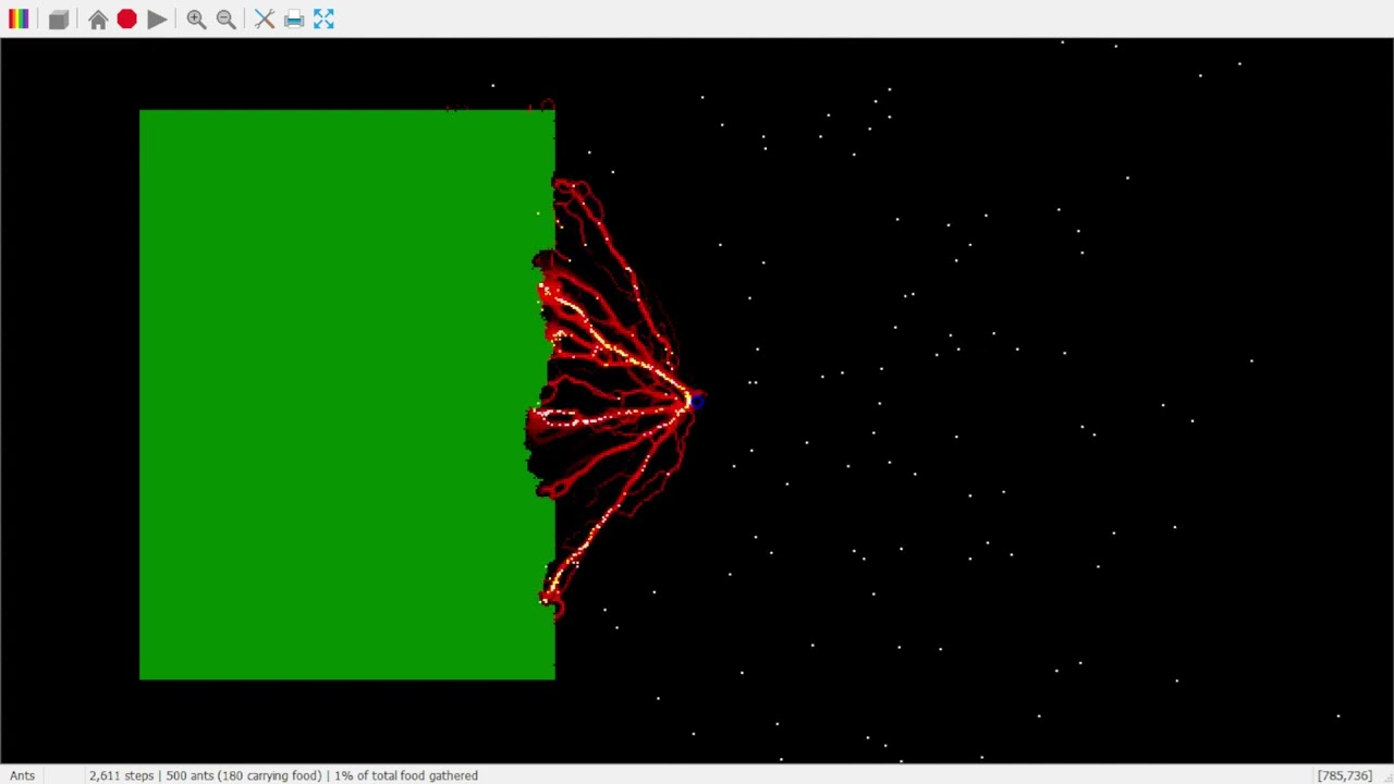 以下のムービーで生成されているAnt Colonyでは、画面左にある緑色のブロックを、アリ(白い点)が動いて自分の巣(青い点)に戻りながら軌跡(赤い線)を描いていく様子を見ることができます。