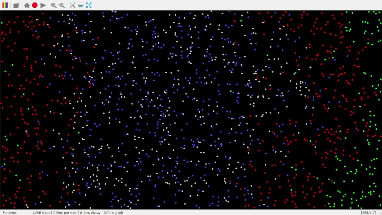 実際にパンデミックのモデルがどんな感じなのかは以下のムービーで見ることができます。緑が未感染者、赤が感染者、青が回復者、白が死者になります。