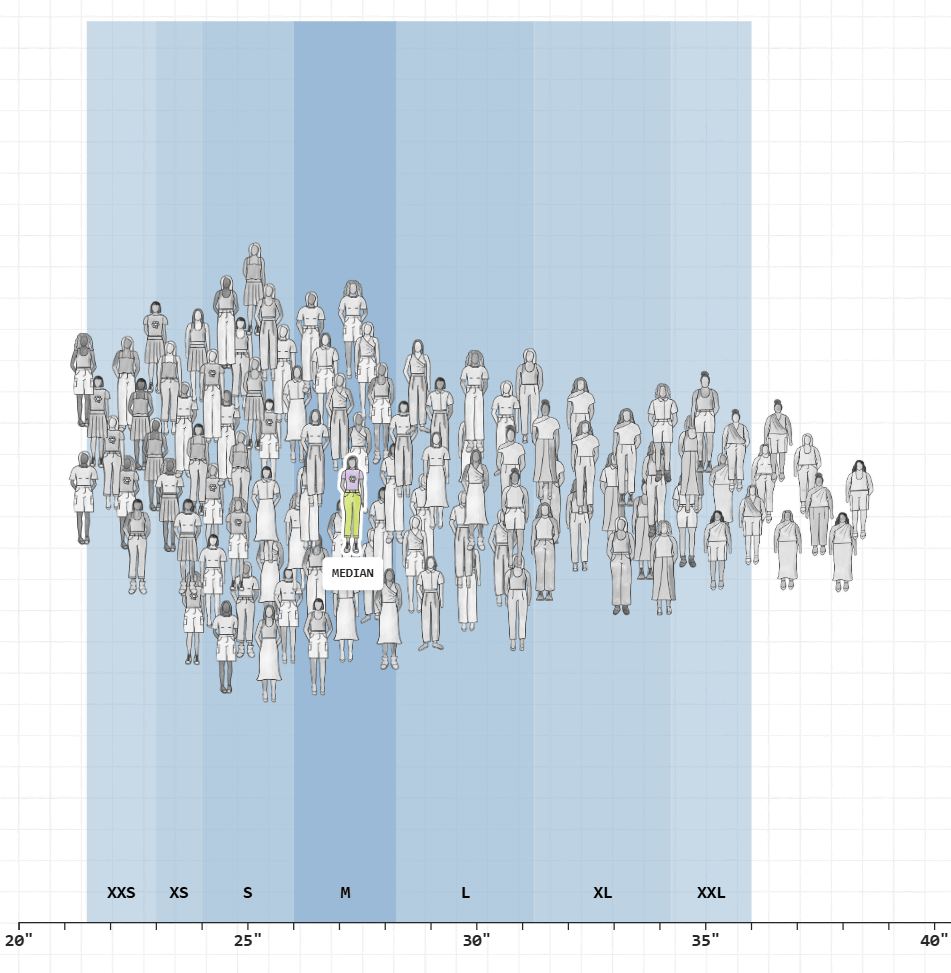 以下は、国立健康統計センターによるアメリカの10歳・11歳女子のウエストの数値をもとにした、服のサイズの分布を示した図です。中央値はウエストが26~28インチ(約66~71cm)で、ピッタリなサイズは「ジュニアサイズのM」となるそうです。