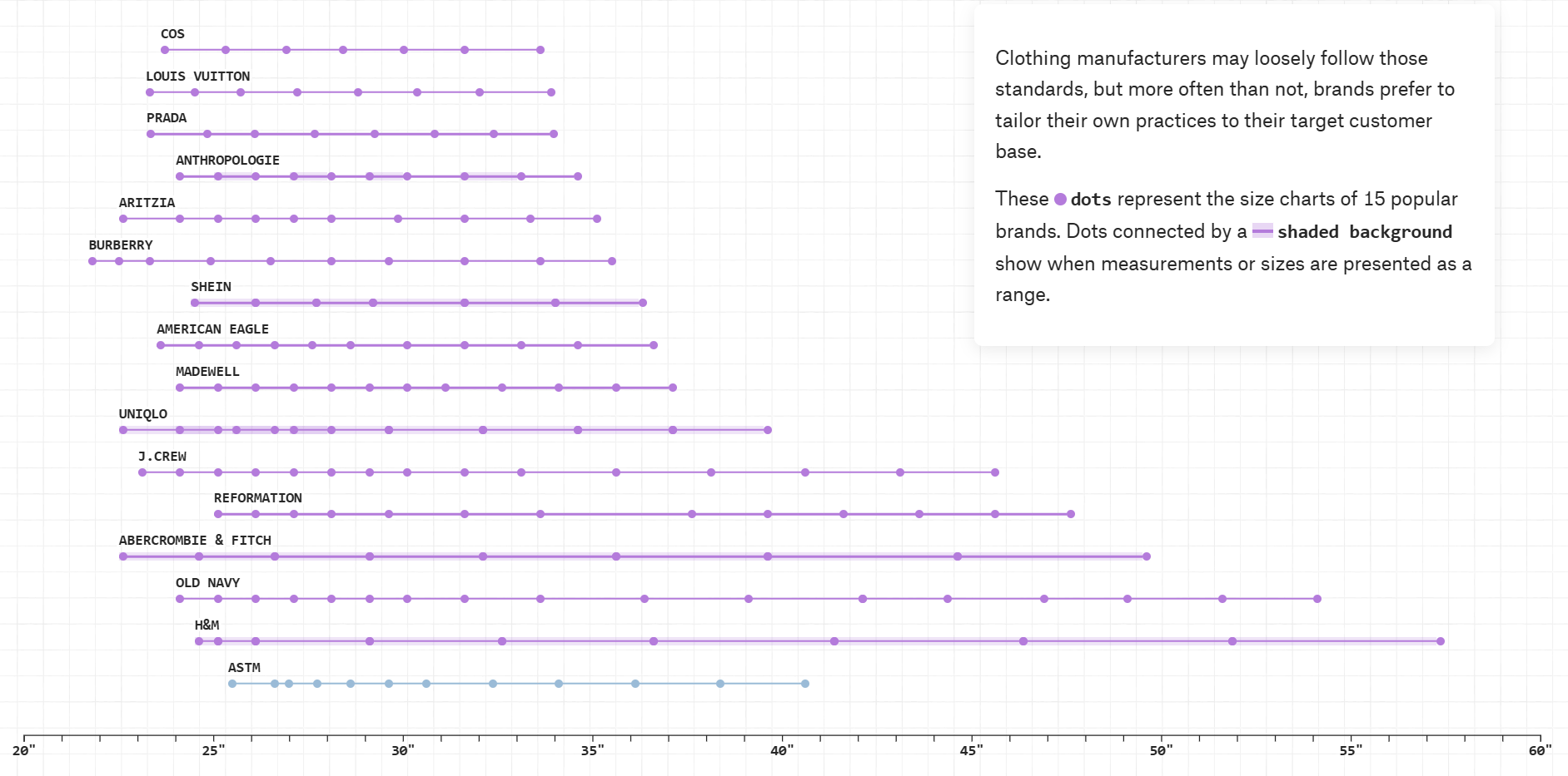 普遍的なサイズ基準はありませんが、ASTM Internationalが非公式のガイドラインを定期的に発表しています。衣料品メーカーはこれらの基準に緩く従う場合もありますが、多くの場合、ブランドはターゲット顧客層に合わせて独自の慣行を調整することを好むため、サイズは大きく異なってしまうわけです。
