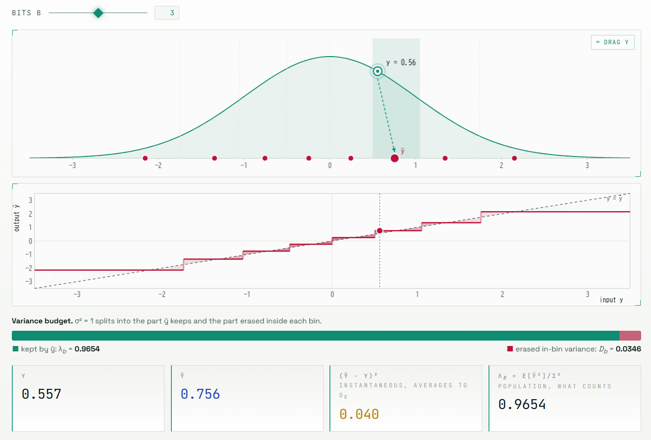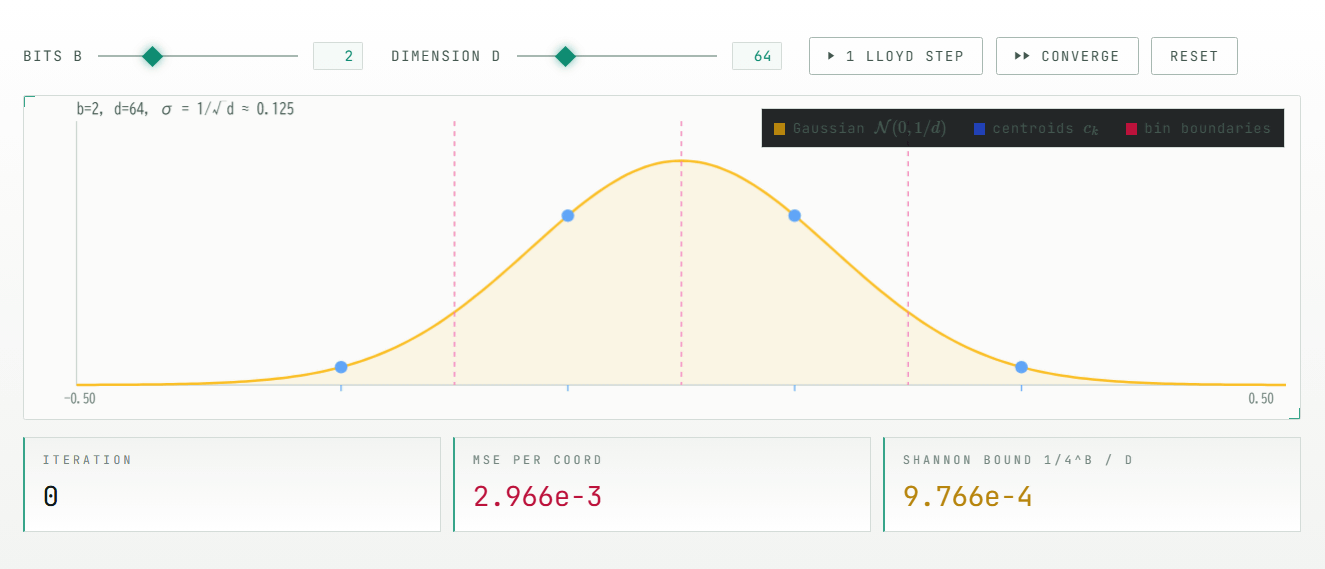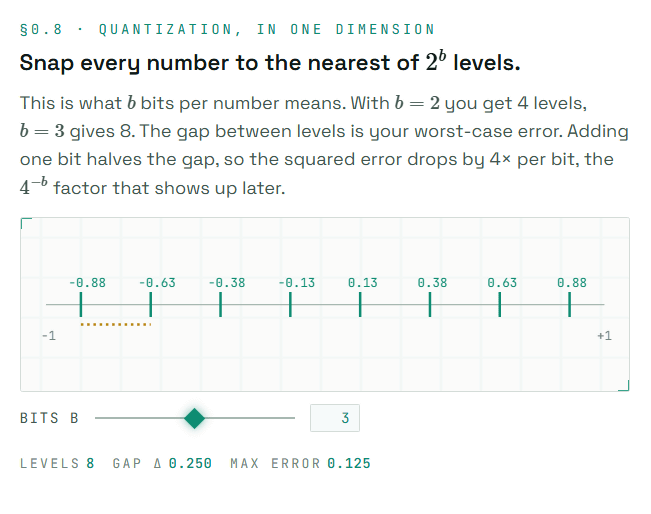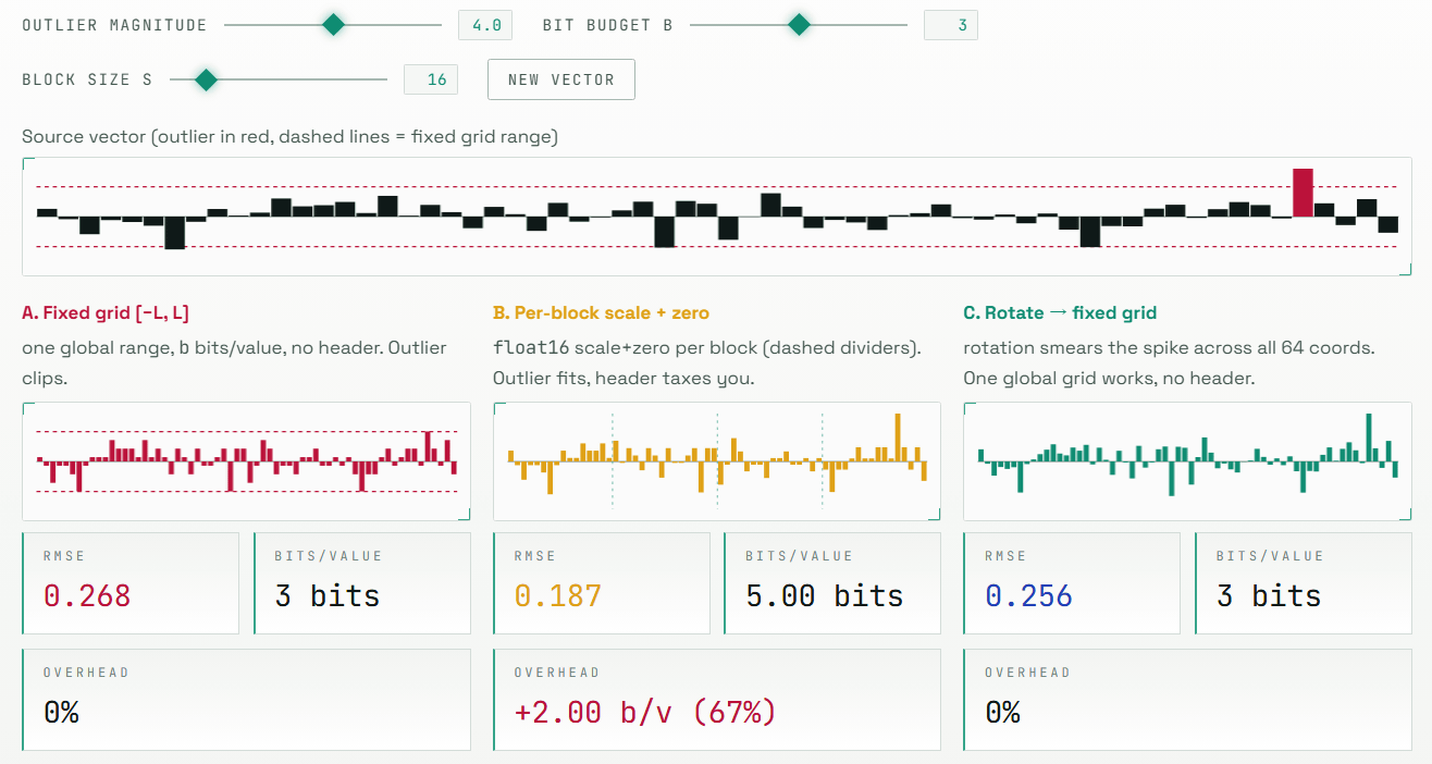 「TurboQuant: A First-Principles Walkthrough」の良いところは、TurboQuantをいきなり数式で説明するのではなく、ベクトル、内積、量子化、回転といった基礎から、画面上で動く図を使って順番に理解できるようにしている点です。サイト内のグラフはライブで動作し、数値もブラウザ上で計算されるため、読者はスライダーやドラッグ操作を通じて「なぜその処理が必要なのか」を目で追うことができます。