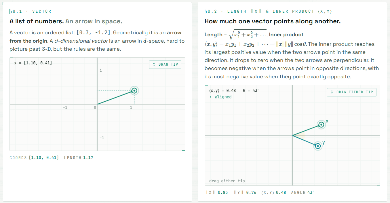 例えば、以下は「ベクトルとは数値のリストであり、空間上の矢印である」という基本的な知識、そしてベクトルの内積とは何かを視覚化しています。