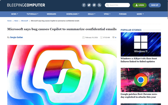 Microsoftによると、取り込みをブロックすることを目的とした「機密ラベル」が付けられているメッセージをCopilotが取り込んでしまうというバグが確認されており、2026年2月第1週から修正プログラムの配信を開始したとのこと。