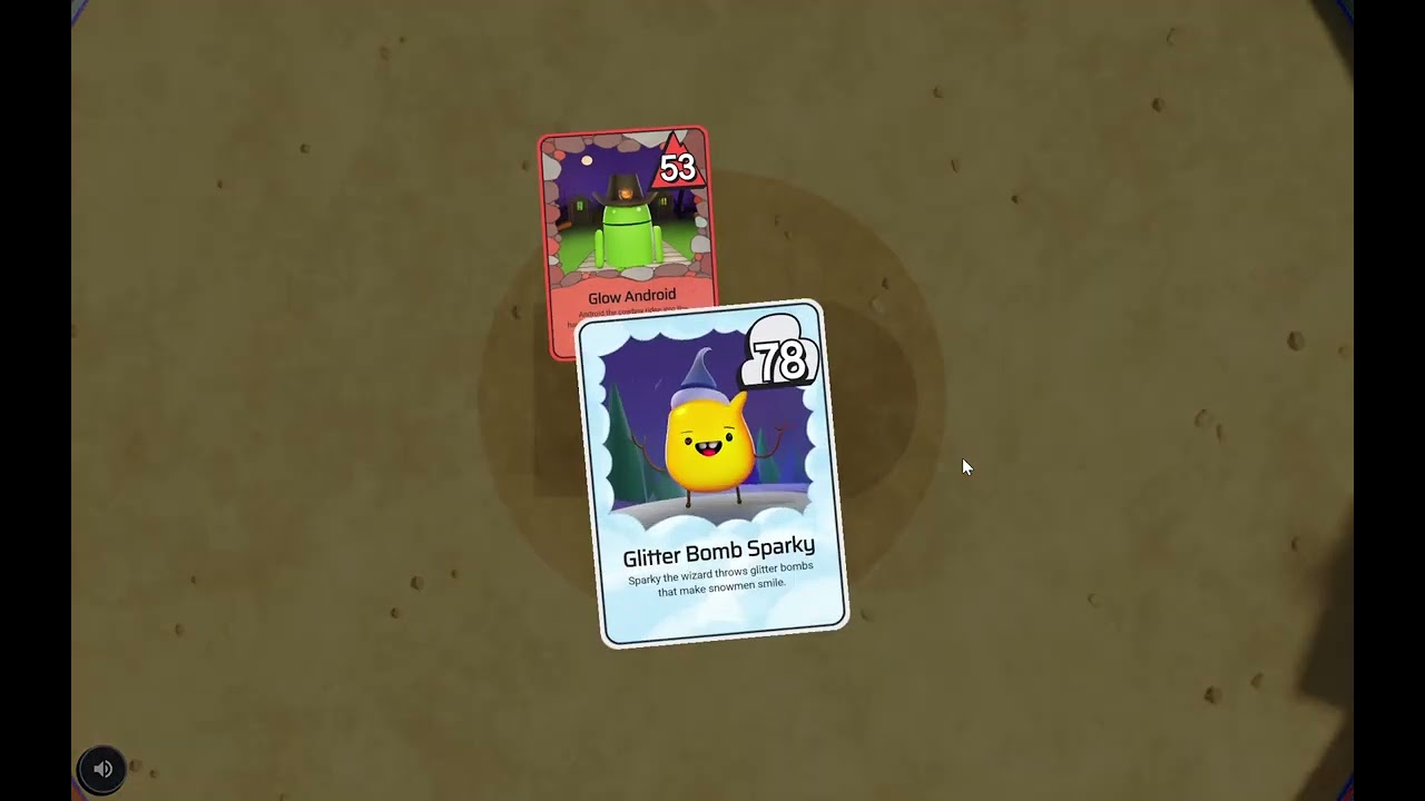 選択した職業とスペシャルパワーに応じたカードが12枚配られるので、この中から3枚選んでデッキを構築します。カードに書かれた絵やフレーバーテキストは、すべてAIにより生成されたもの。一番上に表示されているカードには「Android the glitter wizard sprinkles the stars with spakles(キラキラ魔法使いのアンドロイドが星に輝きを振りまく)」と記載されています。右上の数字は攻撃力です。