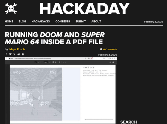 Hackadayによると、DoomPDFが古いDOS環境などをエミュレートする仕組みである「DOSBox」を使っていたのに対し、「スーパーマリオ64 PDF」は外部プログラムやエミュレータに依存せず23.5MBのPDFだけで動くスタンドアロン形式になっているとのこと。なお、「スーパーマリオ64 PDF」を動かすためにはJavaScriptを実行できるPDFリーダーが必要です。
