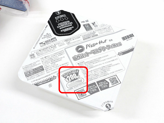 外装フィルムを剥がすとこんな感じ。赤枠で囲った部分にピザハットの200円引きクーポンコードが記されています。