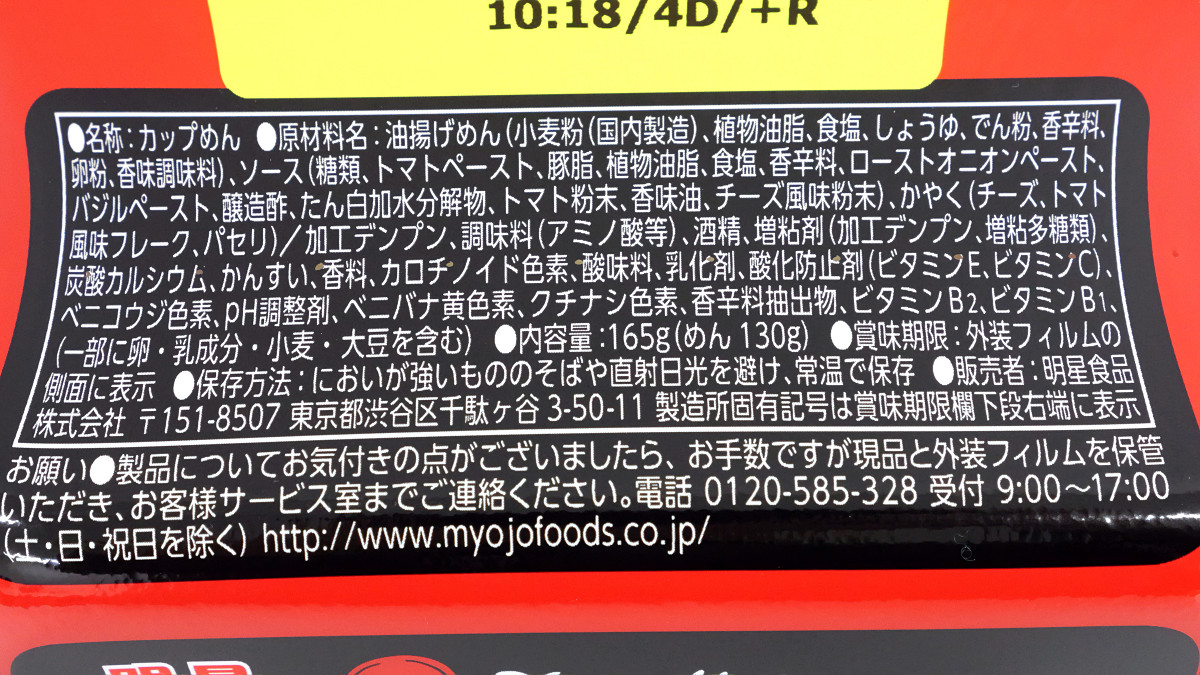 原材料を確認。ソースにはトマトペースト、ローストオニオンペースト、バジルペースト、トマト粉末、チーズ風味粉末が含まれています。また、かやくにはチーズ、トマト風味フレーク、パセリが使われています。