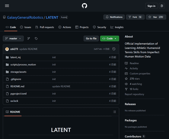 GitHub - GalaxyGeneralRobotics/LATENT: Official implementation of Learning Athletic Humanoid Tennis Skills from Imperfect Human Motion Data · GitHub