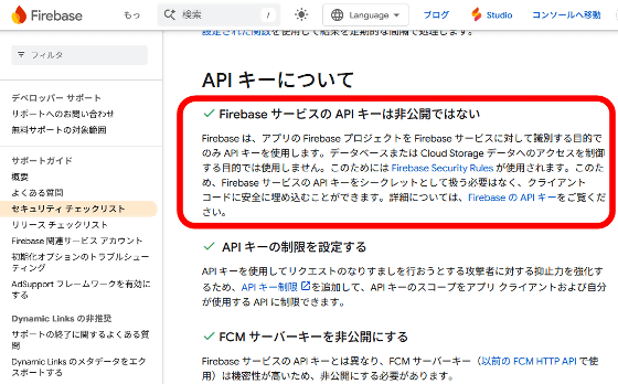 Firebaseのドキュメントには「FirebaseサービスのAPIキーは非公開ではない」と記されており、コード内に安全に埋め込むことができると案内されています。