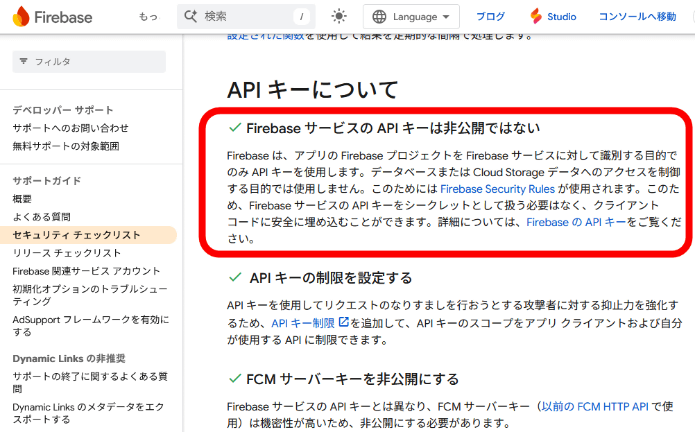 Firebaseのドキュメントには「FirebaseサービスのAPIキーは非公開ではない」と記されており、コード内に安全に埋め込むことができると案内されています。