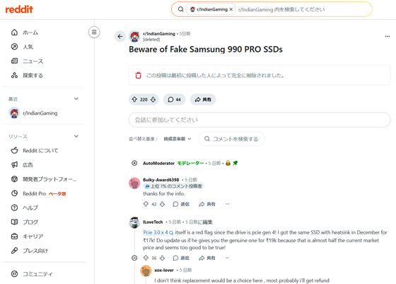 コメントには「ECプラットフォームのFlipkartでSamsungのmicroSDを買ったら偽物だった。Samsungに偽物である旨の書面を出してもらって提出したのに、Flipkart側が内部基準を理由に認めず対応してもらえなかった」という体験談や、「AmazonでSSDを売っている知人が返品を受けたら、正規品が偽物にすり替えられて戻ってきたらしい」という流通面のリスクを示すコメントなどがありました。