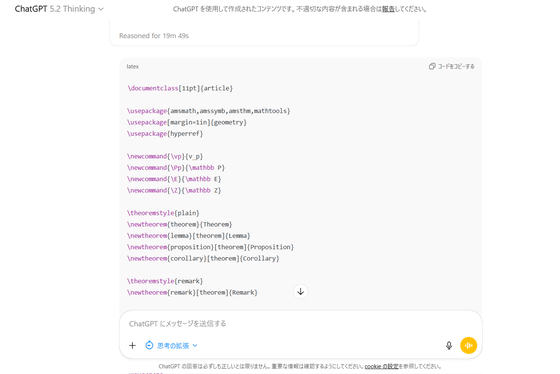 しかし、2025年12月に登場したGPT-5.2 Proは、証明を作る途中で埋め切れない補題がある場合に、無理にでっち上げず「ここが未解決だ」と正直に言う傾向があり、全体の骨格はかなりの割合で正しかったとのこと。そこで、ThunderBeanage氏は最終的に「ネットありのGPT-5.2で問題の意図と方針を整理し、LaTeXで記述した短いプロンプトを作る」→「別インスタンスのGPT-5.2にネットを禁止した上でそのプロンプトを与えて証明を書かせる」→「別インスタンスに検算と修正をさせる」という方法を考案しました。