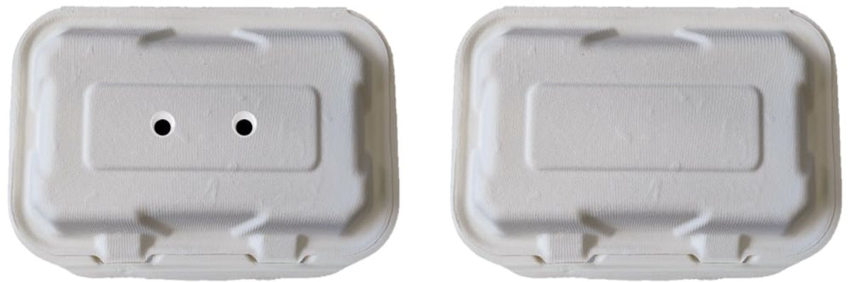 以下の画像は、左が「目のシールを貼り付けたテイクアウト容器」で右が「シールを貼らなかったテイクアウト容器」です。実験の結果、カモメは目のシールが付いたテイクアウト容器を敬遠し、目のシールがないテイクアウト容器と比べて近づくまでの時間が長く、つつかれる可能性が減りました。
