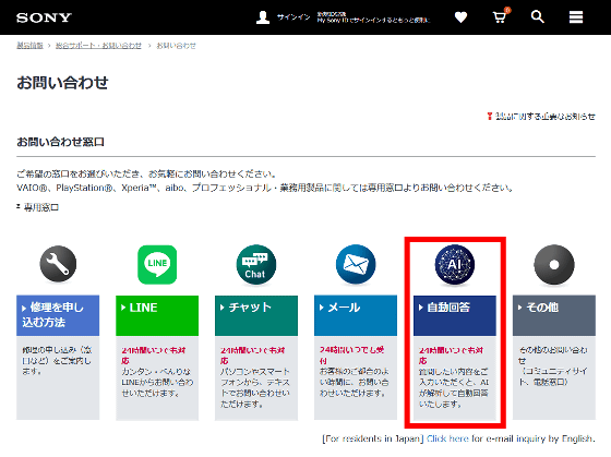 問い合わせ方式はLINEやチャット、メール、自動回答などが用意されていました。今回は最も素早く問い合わせできそうな自動回答をクリックしました。