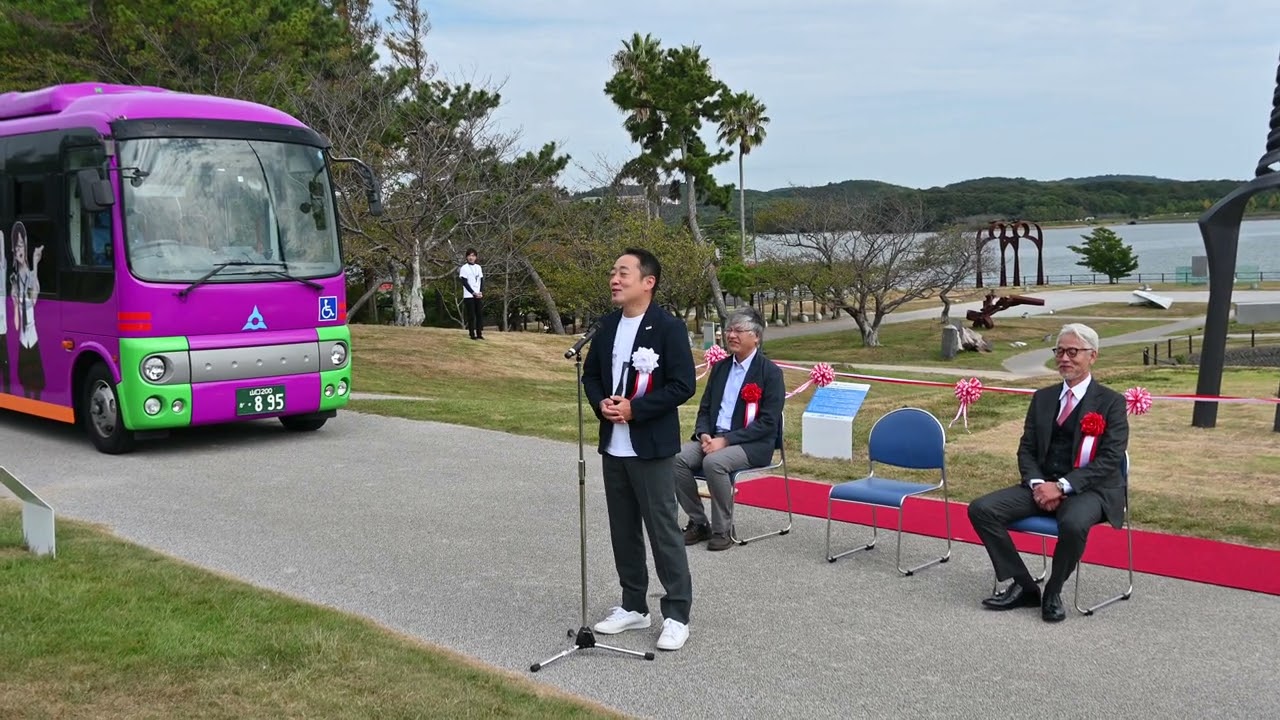 そばに、宇部市交通局のラッピングバスがやってきました。