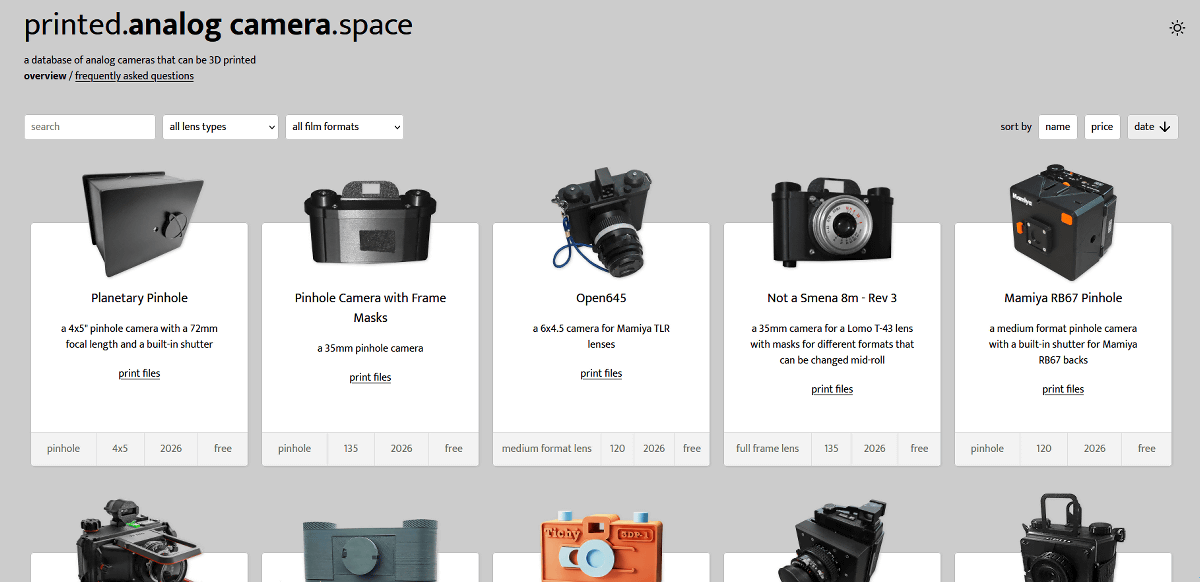 「printed.analog camera.space」は写真家のSebastian Lay氏が公開しているウェブサイトで、3Dプリンターで自作できるフィルムカメラの情報を一覧表示できます。