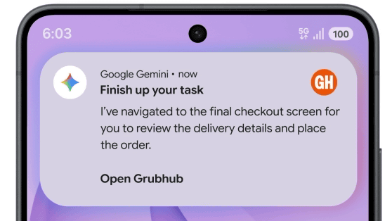 Geminiのタスク実行はバックグラウンドでシームレスに動作するため、ユーザーはそのままスマートフォンを使い続けることが可能です。ベータ版ということで、まずは食品・食料品のデリバリーやライドシェアなどの一部アプリで使うことができるとのこと。