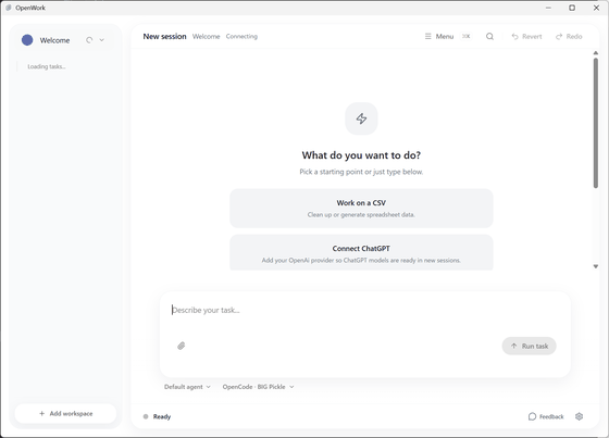GUIアプリケーションとして起動します。AIモデルはデフォルトでOpenCode Zenが利用でき無料で試すことができます。