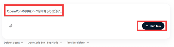 チャット入力欄に「OpenWorkの利用シーンを紹介してください」と入れて「Run Task」をクリックすると…