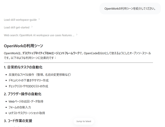 「日常タスクの自動化」や「ブラウザー操作の自動化」などのOpenWorkの利用シーンがまとめられて返ってきました。