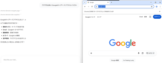 「ブラウザを起動してGoogleのトップページにアクセスしてください」と入力し「Run Task」をクリックすると、ブラウザが起動し指定した通りGoogleのトップページにアクセスしています。