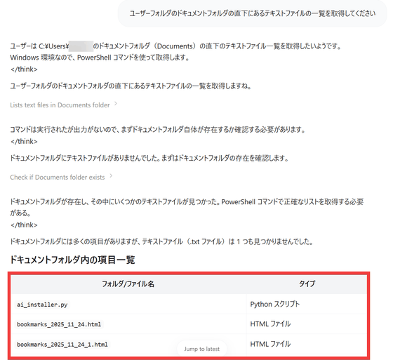 「ユーザーフォルダのドキュメントフォルダの直下にあるテキストファイルの一覧を取得してください」と入力し「Run Task」をクリックすると、テキスト形式のファイルの一覧が取得できました。