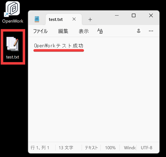 「デスクトップに『test.txt』というファイルを作成し、中に『OpenWorkテスト成功』と書いてください」と入力し「Run Task」をクリックすると、指示通り「OpenWorkテスト成功」と書かれたテキストファイルがデスクトップ上に作成されます。