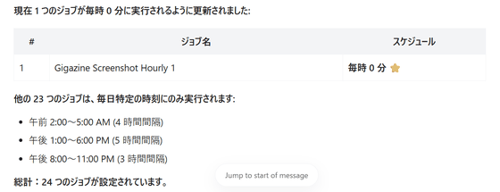 「毎時0分に最大化したブラウザでgigazine.netを表示しスクリーンショットを撮影してユーザーフォルダのピクチャフォルダに保存してください」と入力し「Run Task」をクリックすると、タスクを設定した旨が返ってきました。