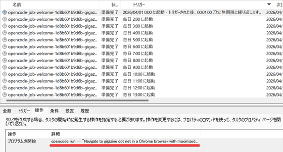 実際は指示した内容を渡すOpenCodeの実行コマンドをタスクスケジューラに登録する作業を行っています。