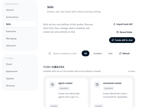 OpenCodeを利用しているのでエージェントスキルやMCPサーバーを登録することで特定の場面で発動するコマンド処理や外部サービスと連携した操作の指示も可能です。