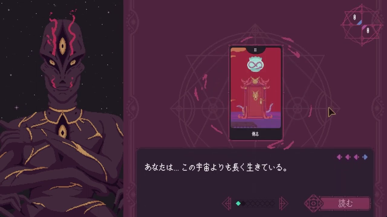 The Cosmic Wheel Sisterhoodはドット絵のアニメーションとアンビエント調のBGMも素晴らしく、ゲームをプレイしているというよりも小説を読み進めているような感覚で遊ぶことができます。自分の選んだ占い結果がさまざまなキャラクターに影響を与えていく様子は、川に投げ込んだ石の生む波紋が広がっていくように、世界の運命に少なくない影響を与えます。自分が運命を左右しているはずなのに、さまざまなキャラクターと話しながらストーリーを体感することで、大きな宇宙の運命のうねりに自分が翻弄されているような感覚を覚えました。