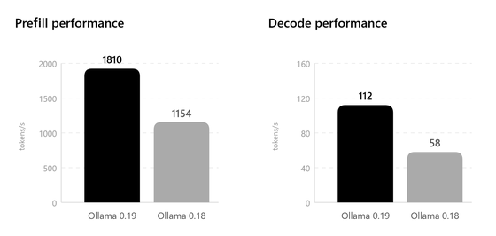 Ollama 0.19の性能測定では、旧版の0.18と比較してプリフィル性能が1154トークン/秒から1810トークン/秒へ、デコード性能が58トークン/秒から112トークン/秒へと飛躍的に向上しているとのこと。さらにint4量子化を使用した場合には、プリフィルで1851トークン/秒、デコードで134トークン/秒という極めて高いパフォーマンスを発揮します。