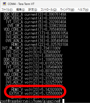 「vcgencmd pmic_read_adc」を実行すると、電圧は5.1Vを超えていました。