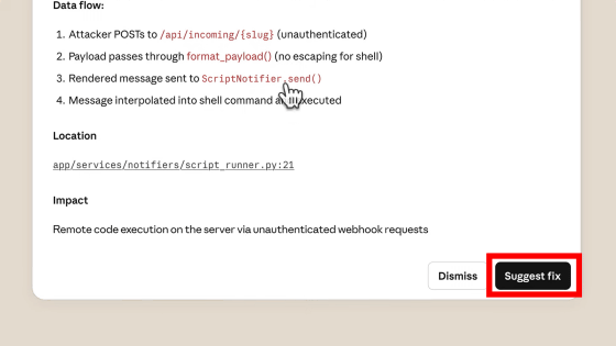 脆弱性の一覧が表示されました。Claude Code Securityはパターンマッチではなく人間のセキュリティ研究者と同様に「コードを読んで推論する」という手順で脆弱性を探索するため、既存の自動テストツールでは検知の難しい脆弱性も見つけることができます。また、発見された脆弱性は複数段階の検証プロセスを経て誤検知の除外や重大度の割り当てを経てダッシュボードに表示されます。