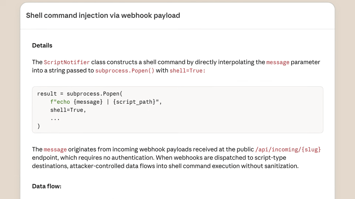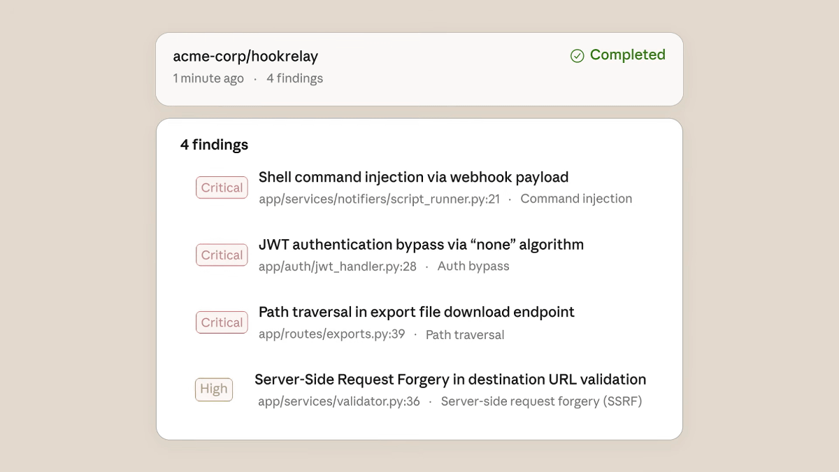 脆弱性の一覧が表示されました。Claude Code Securityはパターンマッチではなく人間のセキュリティ研究者と同様に「コードを読んで推論する」という手順で脆弱性を探索するため、既存の自動テストツールでは検知の難しい脆弱性も見つけることができます。また、発見された脆弱性は複数段階の検証プロセスを経て誤検知の除外や重大度の割り当てを経てダッシュボードに表示されます。
