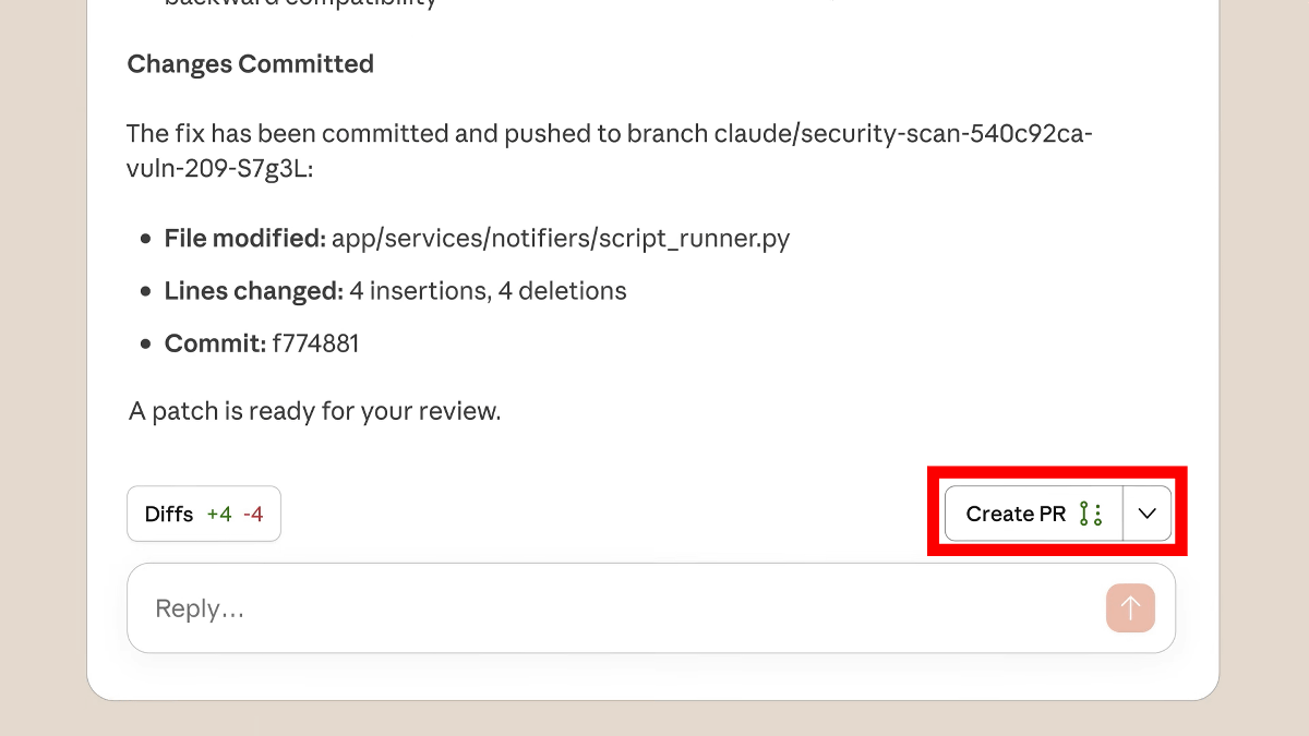 修正は自動的に反映されることはなく、人間が「Create PR」をクリックした場合のみ反映されます。