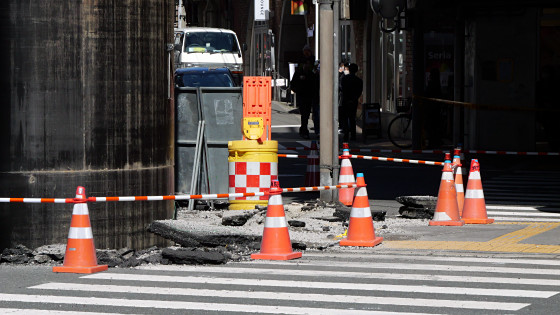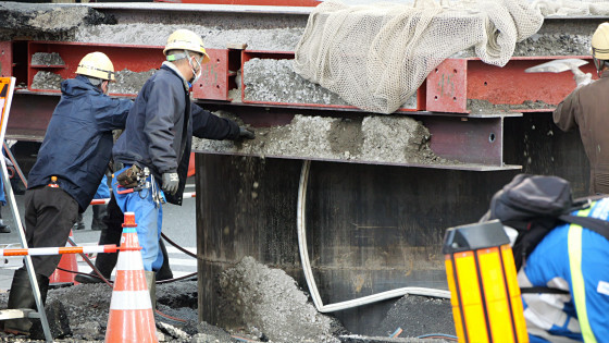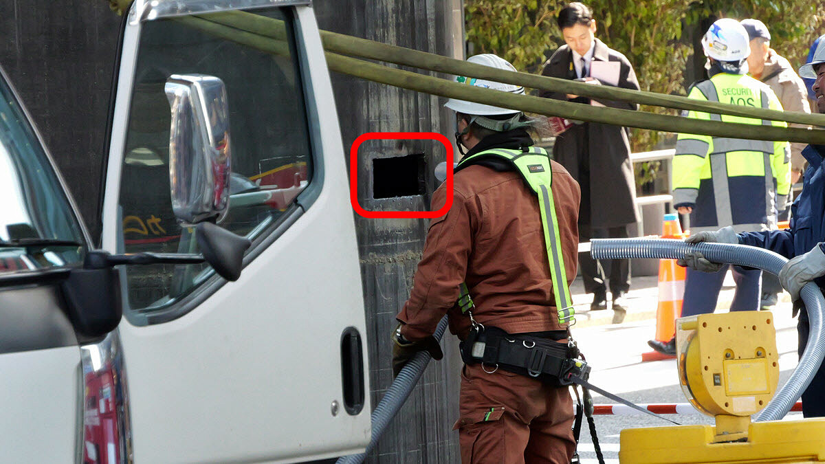 人間が横に並ぶと下水管の巨大さが分かります。報道によると、現場では「浅い深度にある古い下水道管」と「深い場所に埋設する新しい下水管」をつなぐために垂直方向のパイプを設置する作業が行われていたとのこと。パイプの埋設工事は2026年3月11日までに「パイプ内にたまった地下水を排出する作業」まで終えた段階で、あとはマンホールのフタを設置する予定だったそうです。ところが、何らかの要因でパイプがせり上がってしまったというわけです。