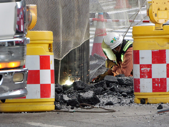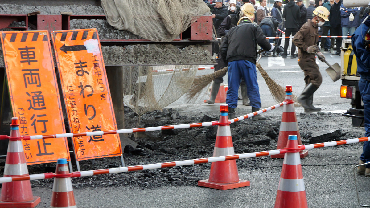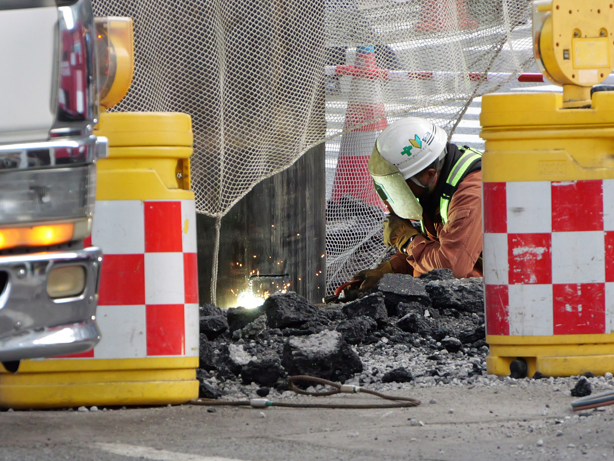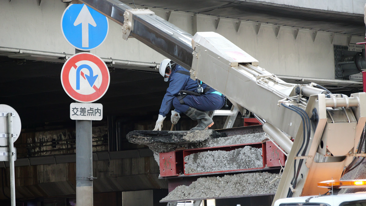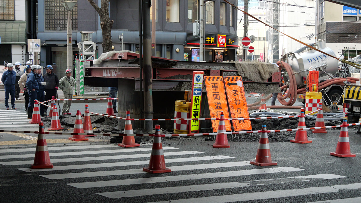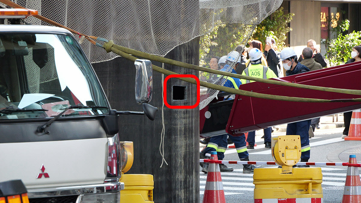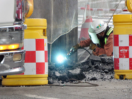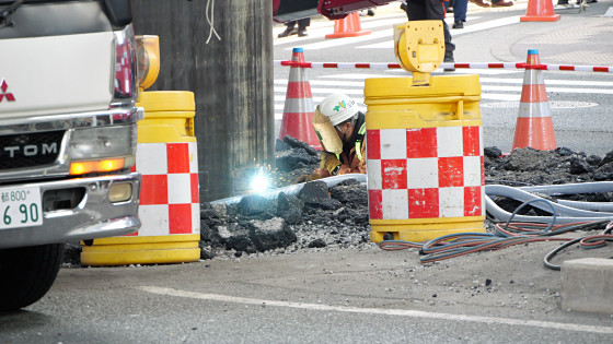 パイプはそれなりに安定しているようで、途中で作業員が上部にのってはみ出たアスファルトを砕こうとする姿もありました。