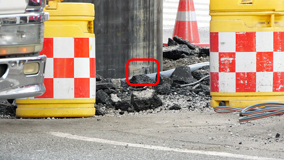 パイプの周辺には砕けたアスファルトが散乱しており、アスファルトを突き抜けてパイプが突き出したことが分かります。