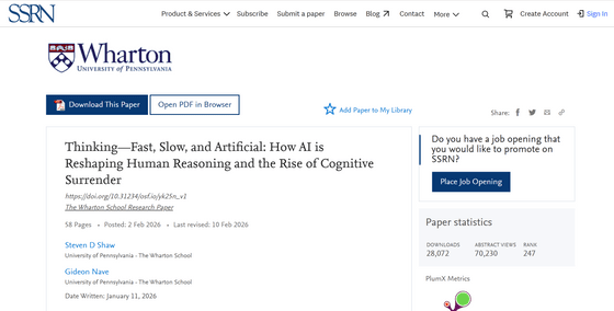 ペンシルベニア大学の研究チームが、AIの発展によって多くの人間が「AIに全て任せる」という思考プロセスを採用していることを実験でつきとめ、論文で発表しました。