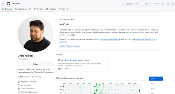 データサイエンスの専門家であるアルボン氏は、テクノロジー企業や非営利団体で10年以上活躍したのち、2020年1月からウィキメディア財団の機械学習担当責任者を、2025年1月からは機械学習およびデータエンジニアリング担当責任者を務めており、ウィキペディアやその他のウィキメディアプロジェクトにおける人工知能の開発と実施を主導しています。