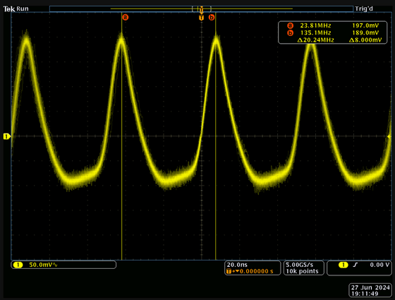 オシロスコープでBIS0001に入力されている中間周波数信号を確認してみるとこんな感じ。センサーの性能を確かめるために10maurycy10氏はノートPCをセンサーに向かって動かしましたが、センサーはPCの動きだけでなくその前後の手の動きなども検知しています。