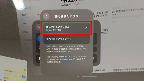 「許可されたアプリ」では、その時点で開いているアプリのみへのアクセスを認めるか、すべてのアプリへのアクセスを許可するかを選べます。今回はSafariとAppleTVと「株価」を開いた状態で、「開いているアプリのみ」を選択しました。